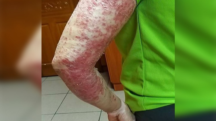 收治這名病患的中醫師羅永欽表示,去年10月31日徐小姐來到診間時,主述紅疹發滿全身,包括頭皮、耳朵、頸部、身體及四肢,嚴重時甚至雪花片片,每天早晨起床後脫落的皮屑可以盛滿一盤子醬油碟,讓原本皮膚白白嫩嫩又極愛漂亮的徐小姐,對於遭遇突如其來的皮膚病侵襲,簡直欲哭無淚,尤其初期治療過程暫停使用類固醇後,皮膚反彈導致紅腫脫屑更加嚴重,不僅害怕出外社交,自卑心理讓她將頸部用圍巾包得密不透風。