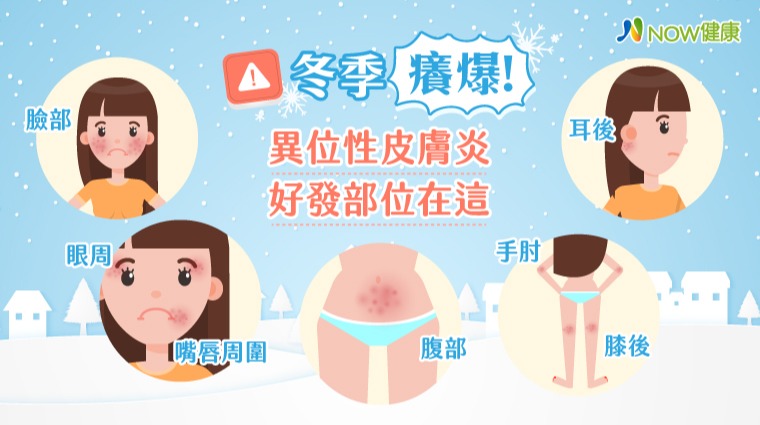 ▲異位性皮膚炎盛行於冬季,好發於臉部、耳後、腹部、手肘、膝後等,然全身皮膚都有可能,因人而異。(圖/NOW健康製作)